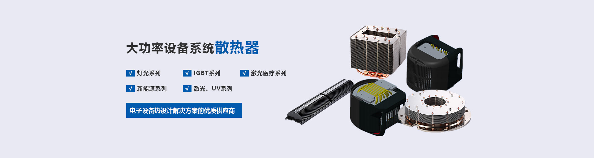 是具有電子設備熱設計解決方案的優質供應商。主要產品有銅材、鋁材、銅鋁復合散熱器、熱管散熱器、水冷散熱器等。產品用于LED、舞臺燈光、大型服務器、光伏、風能、變頻器、軌道交通、新能源汽車、儀器設備等